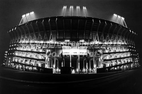 Jordan Hare Stadium, black and white night shot. Historic first time lights were turned on.